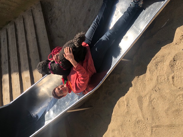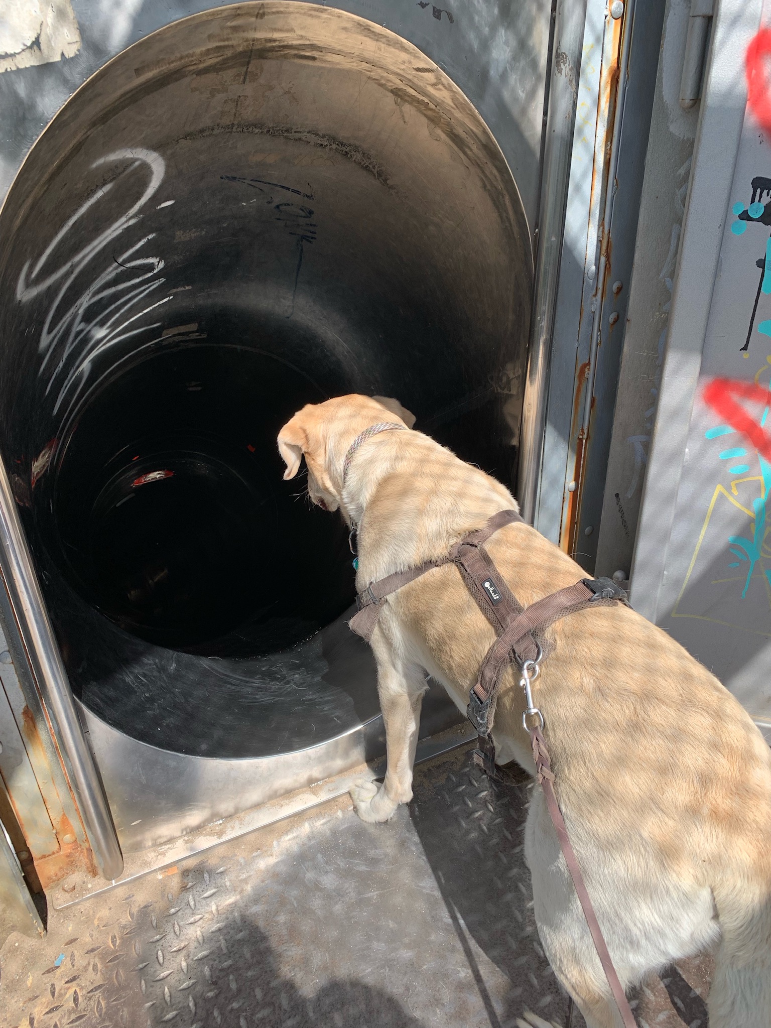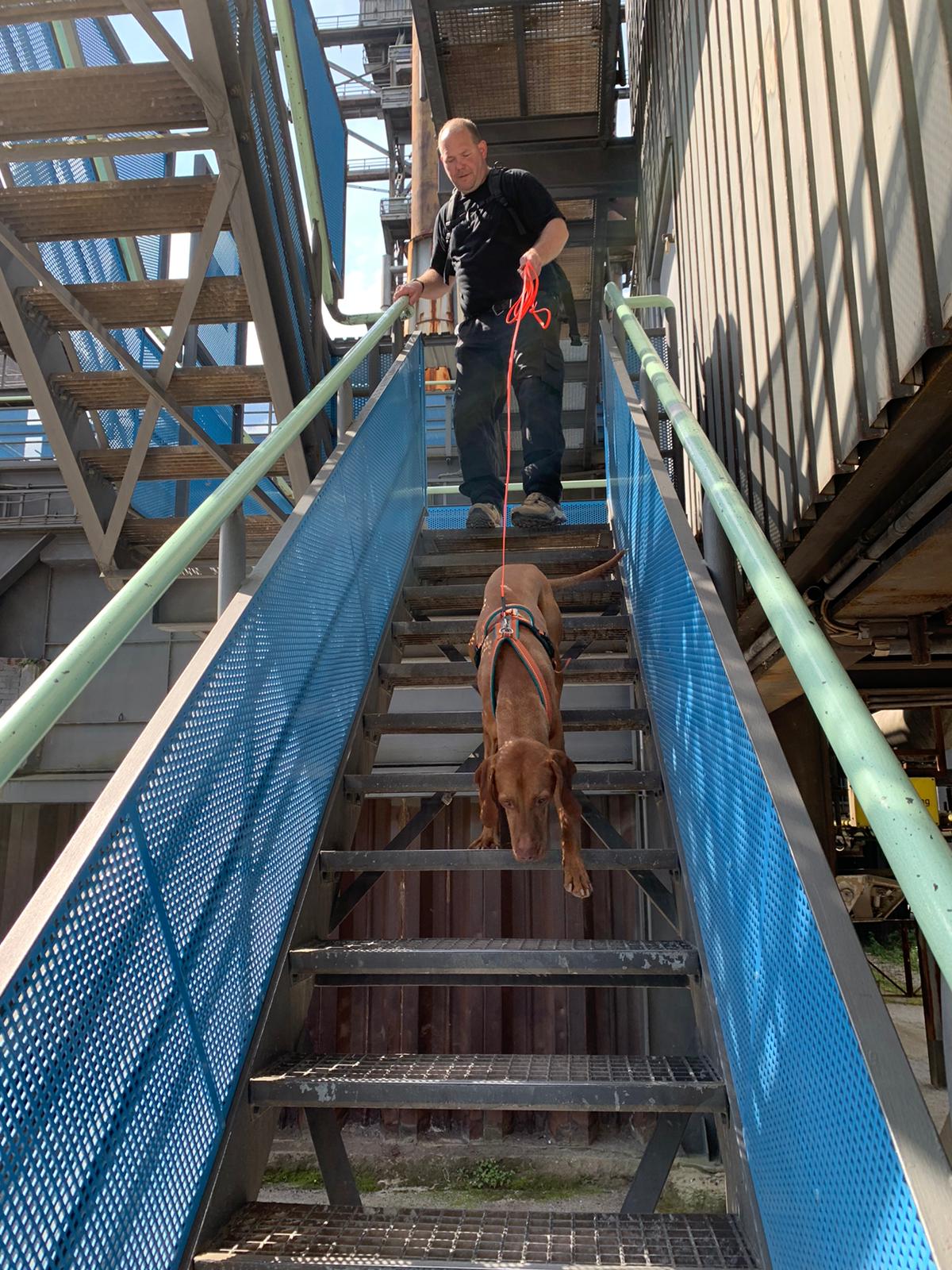 Der Hund zeigt das der Trail durch die Rutsche führt.